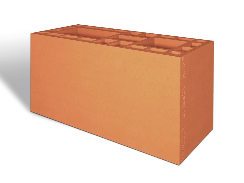 Bloco cerâmico de vedação com parede lisa e furo vertical, utilizado para amarrações em “L” da linha de blocos de vedação FV 14x19x34.