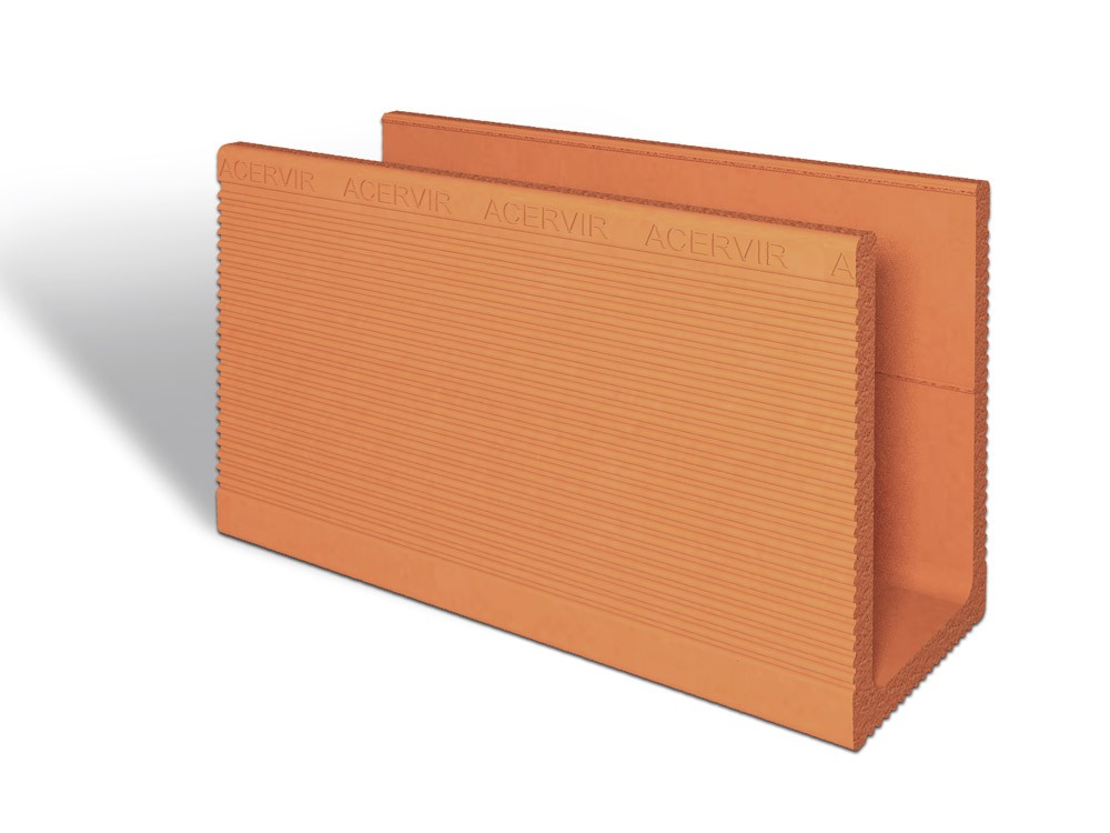 Canaleta cerâmica da linha de bloco de vedação FH com largura de 11,5 cm, utilizada para executar vigas, vergas e contra vergas, dispensando o uso de madeira para as caixarias. Oferece mais velocidade da execução da obra, economia e redução de entulho.