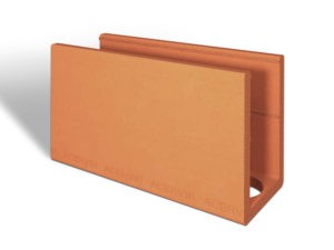 Canaleta cerâmica da linha de blocos estruturais 11,5x19x29 que possui um furo na base para facilitar a passagem de eletrodutos, instalações hidráulicas e ferragem.