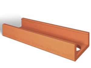 Canaleta cerâmica da linha de blocos estruturais 14x19x39 com formato de “J” que possui um furo na base para facilitar a passagem de eletrodutos, instalações hidráulicas e ferragem.